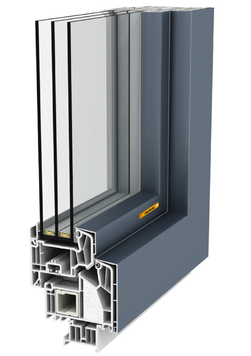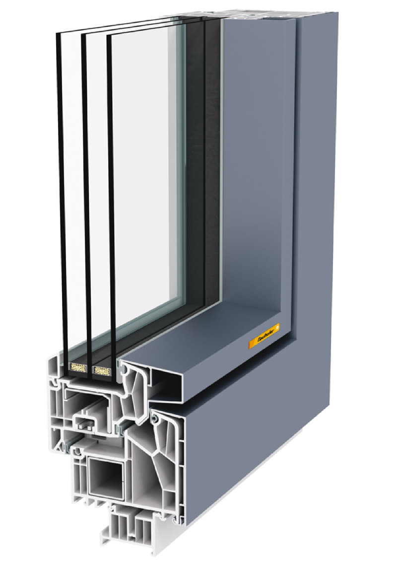 Die Design-Variante PURE mit flächenversetzter Alu-Schale gibt der Außenansicht dieses Kunststoff-Alu-Fensters ein puristisch-kantiges Gesicht: nobel in seiner Zurückhaltung - und cool.